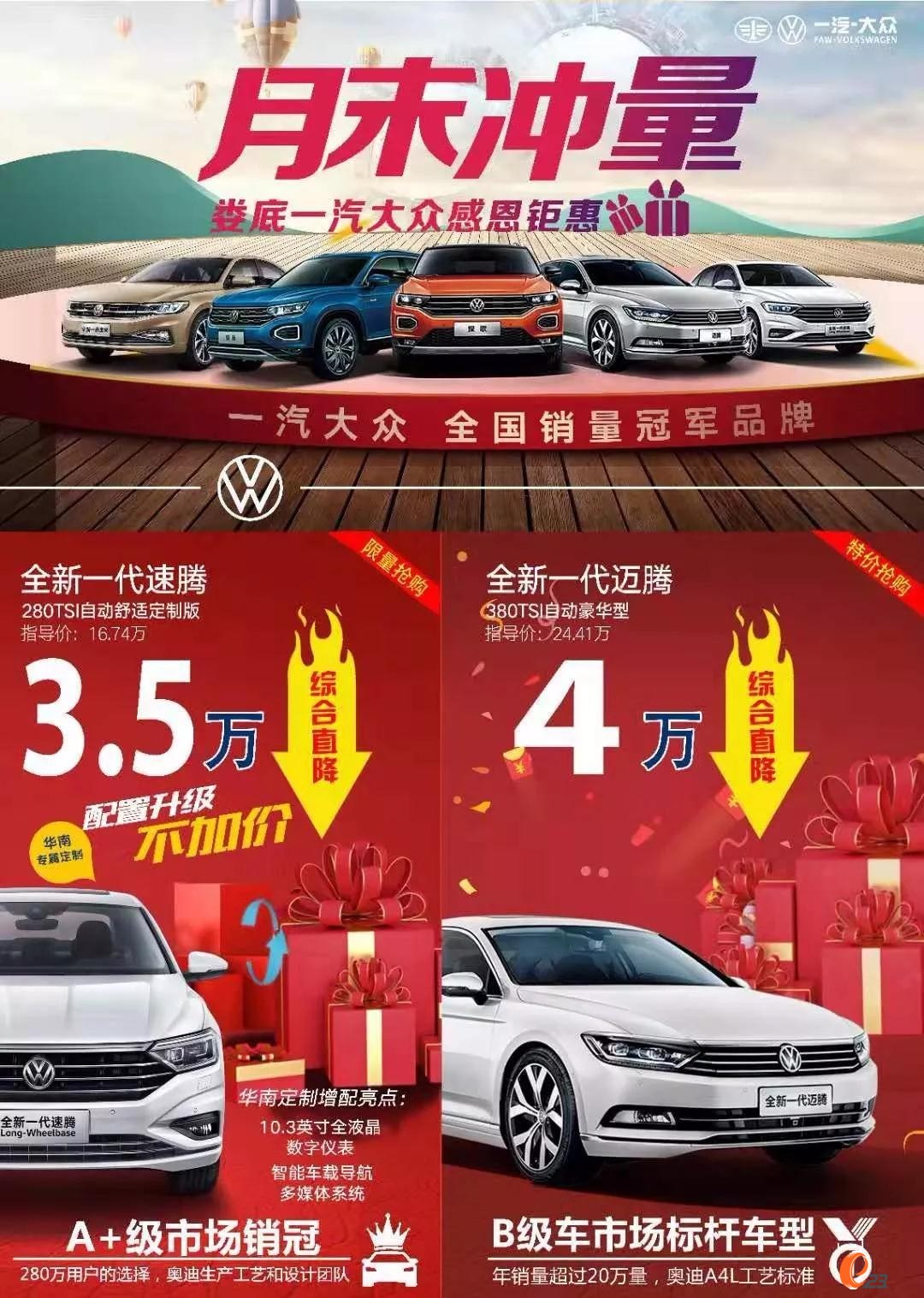 【月末沖量】新速騰定制版加配不加價 綜合直降3.5萬 邁騰最高綜合直降4.6萬