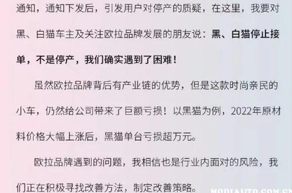 2022年2月23日,歐拉汽車CEO“董玉東”發(fā)布聲明稱:由于2022年新能源汽車原材料價(jià)格大幅上漲,導(dǎo)致歐拉黑貓單臺虧損超萬元,目前車型已經(jīng)給公司帶來了巨額虧損,所以黑貓、白貓均已停止接單,但車型并未停產(chǎn)。