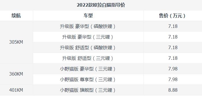 2022款白貓已經(jīng)正式停售了,該車型最早在2021年8月份上市,新車共推出了7款配置車型,售價(jià)區(qū)間在7.18-8.88萬(wàn)元之間。由于2022年新能源汽車原料價(jià)格大幅上漲,導(dǎo)致歐拉白貓面臨虧損,所以該車型在2022年2月份正式停止接單。