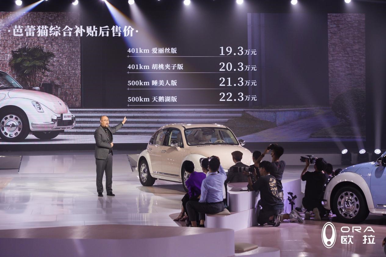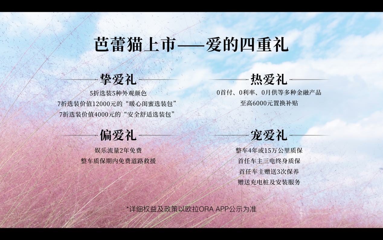 當晚,歐拉芭蕾貓共發(fā)布4個版本,售價19.3萬-22.3萬之間,同時對于購買芭蕾貓的用戶,還帶來了代表歐拉更深心意的“愛的四重禮”。