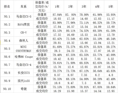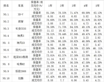 在小型SUV里面,保值率前十名的車型分別是XR-V、繽智、長(zhǎng)安CS35瑞虎3、瑞風(fēng)S3現(xiàn)代ix25、起亞KX3傲跑、哈弗H2、標(biāo)致2008、以及創(chuàng)酷。