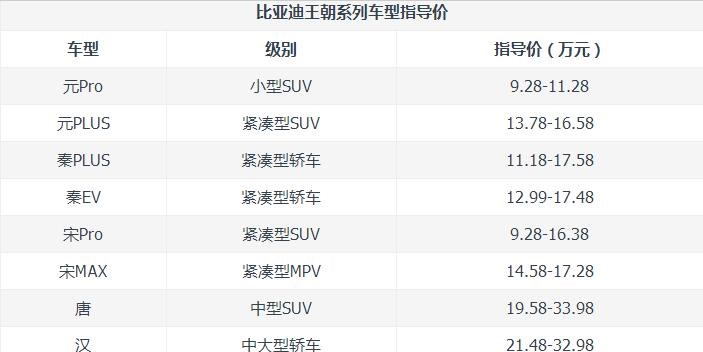 比亞迪王朝系列目前在售車(chē)型包括“秦、唐、宋、元、漢”這幾大車(chē)系,其中定位比較高端的車(chē)型主要為比亞迪漢、比亞迪唐,車(chē)型的具體售價(jià)可以參照以下表格: