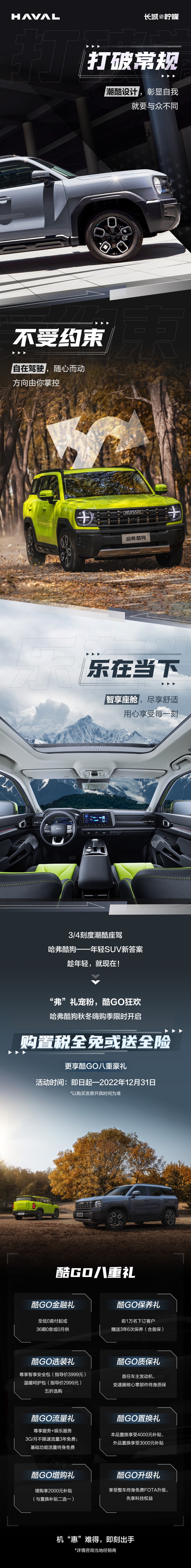 值得一提的是,哈弗酷狗官方指導(dǎo)價僅為12.38-14.98萬元,且免費(fèi)贈送“酷GO八重禮”,包括終身免費(fèi)FOTA升級,首任車主發(fā)動機(jī)、變速器核心零部件終身質(zhì)保等購車福利。此外,即日起到12月31日,凡是購買哈弗酷狗的用戶,還能夠額外享受購置稅全免或送全險的驚喜購車福利!品價比遠(yuǎn)超12.79-17.59萬元的本田XR-V!