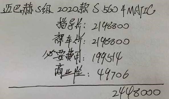 邁巴赫S560現(xiàn)階段在售車型2020款 S 560 4MATIC,同時也處于停產(chǎn)在售狀態(tài),官方指導(dǎo)價219.88萬,全款購車包括車輛購置稅、交強險、車船稅、商業(yè)險、上牌費以及其它手續(xù)費,最后這款邁巴赫S560落地價244.80萬元。