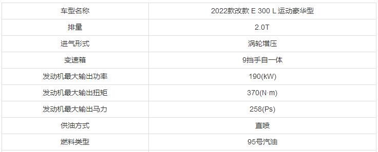 奔馳E級(jí) 2022款 改款 E 300 L 運(yùn)動(dòng)豪華型的動(dòng)力如上表所示,該款車采用的是2.0T 9擋手自一體的動(dòng)力組合,其中最大可輸出258Ps的馬力、370N·m的扭矩及190kW的功率。