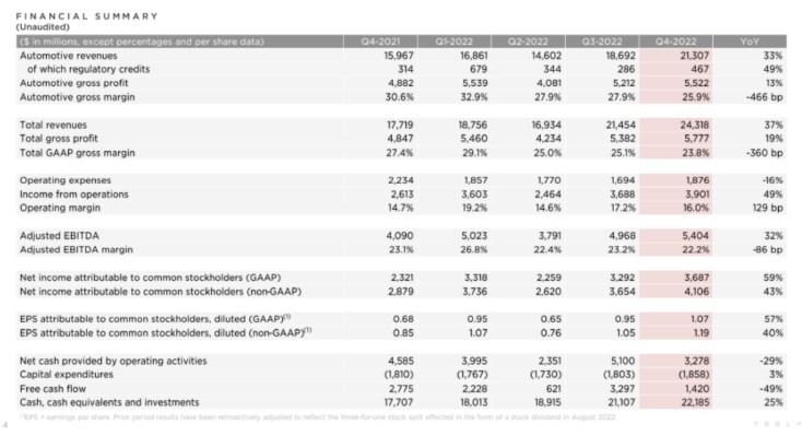 2022年第四季度,特斯拉總收入達(dá)243億美元,同比增長37%;營業(yè)利潤同比增加至39億美元,營業(yè)利潤率達(dá)到16%。