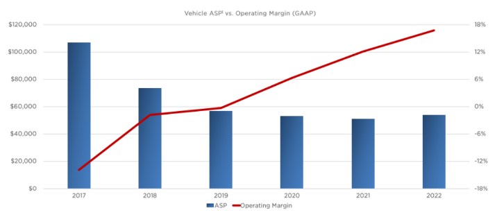特斯拉也是這樣做的。堅(jiān)持不懈的成本控制與成本創(chuàng)新,是其獲得長期成功的信心所在。數(shù)年來,特斯拉的電動(dòng)車平均售價(jià)總體呈現(xiàn)下降趨勢,自2017年至2022年已減半,但運(yùn)營利潤率持續(xù)提升,從約-14%提高到17%。引入更低成本車型、增建更高效的本土化工廠、降低車輛成本和經(jīng)營杠桿……特斯拉仍在不斷追求極致。