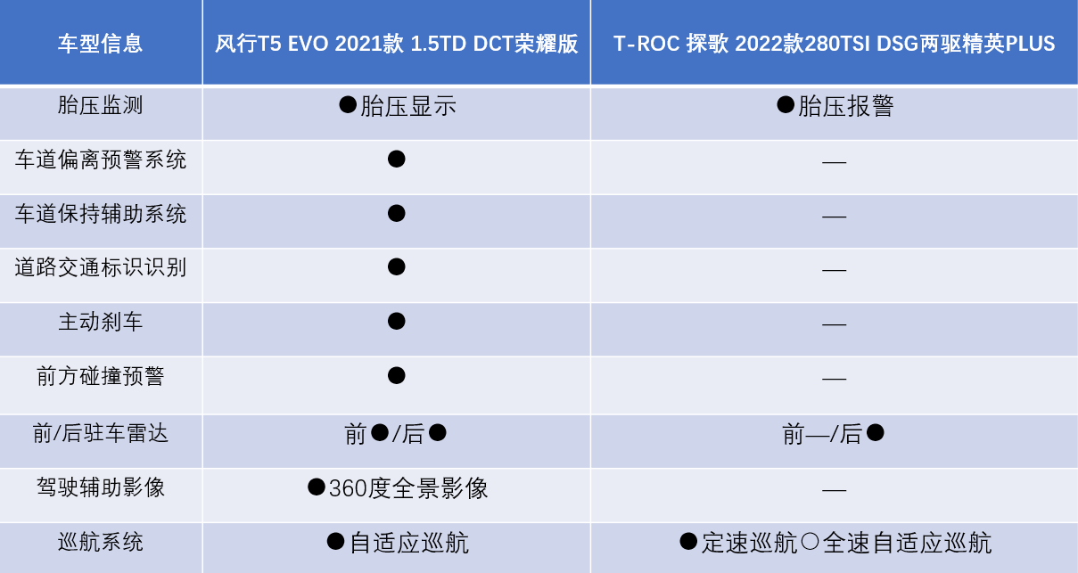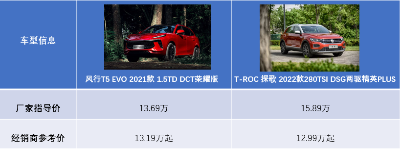 今天我們就選擇同一級別的SUV車型風行T5 EVO 2021款1.5TD DCT榮耀版與T-ROC探歌2022款280TSI DSG兩驅精英PLUS(以下簡稱風行T5 EVO與探歌)做個對比,看看這兩款車在安全性能上誰更出色?