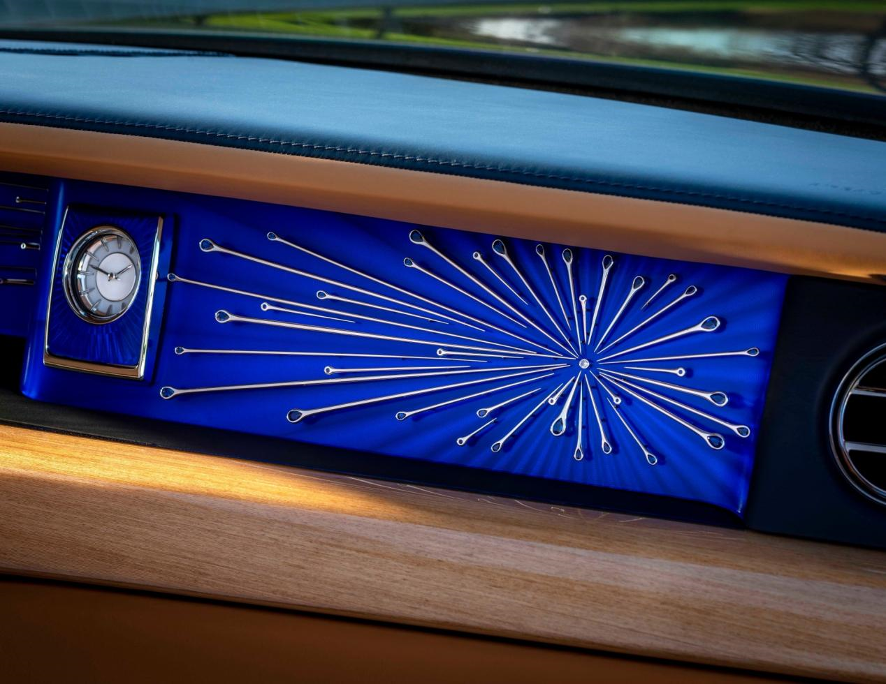 針對此次定制,勞斯萊斯Bespoke高級定制設(shè)計師們打造了全新的星光尾門。這一獨特的配置將192顆柔和閃光的“星星”匯集于穿孔皮革內(nèi)飾之中。當尾門打開時,將車內(nèi)星光頂璀璨的星空氛圍延伸至車外。