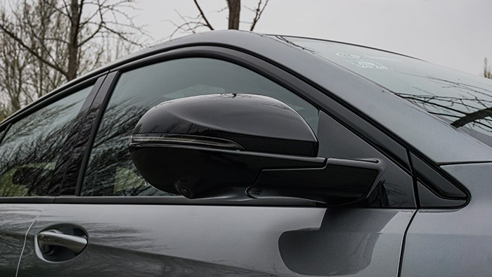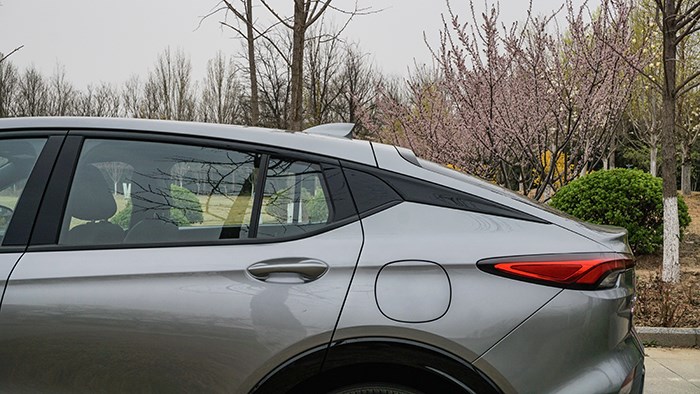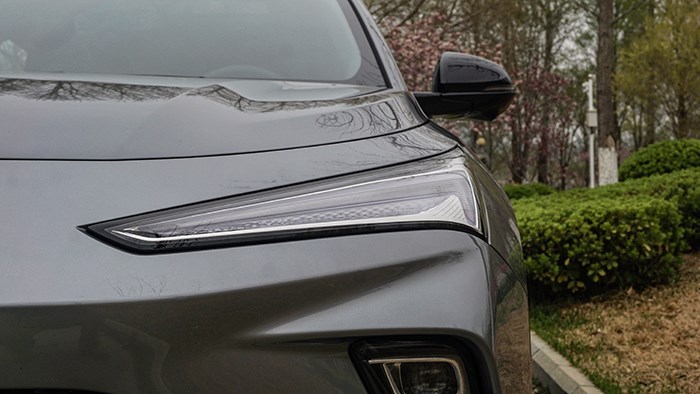 車輛的燈組設(shè)計的像一塊細(xì)長的三角形,三角形的尖頭部分也呈現(xiàn)向里傾斜的角度,指向車頭中間的車標(biāo)。燈組的外殼即使是在太陽光下也呈現(xiàn)一種比較深的白色,看起來很明顯,尤其搭配上我們試駕的這輛晨星藍(lán)的外觀顏色,藍(lán)白的搭配看起來格外清新。