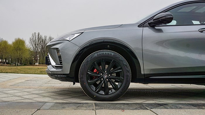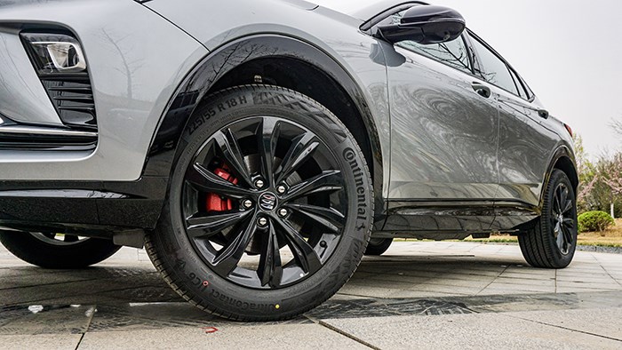 車型配備18英寸五輻式輪圈,并搭配紅色卡鉗等專屬套件,在別克車型上較為常見。輪胎采用的是馬牌UC6系列,尺寸為225/55 R18,主打靜音舒適,同時兼顧一定的操控性能。