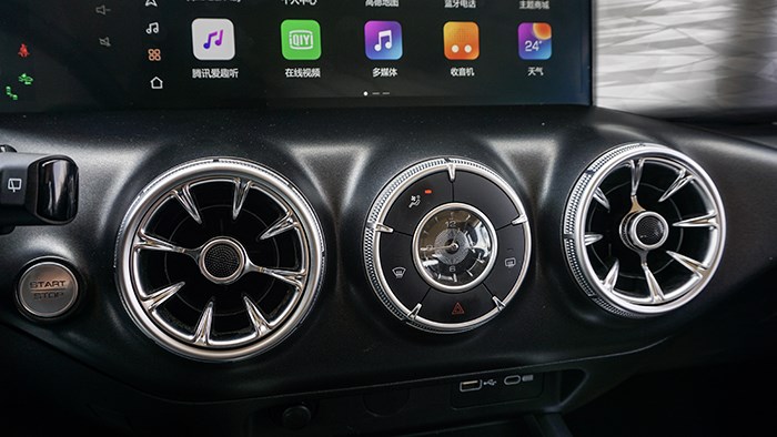 空調(diào)出風(fēng)口為漩渦的造型,兩側(cè)為真正的出風(fēng)口,中間則是集成了空調(diào)控制面板以及機(jī)械鐘表。在夜間新車氛圍燈的營造氛圍感滿滿。