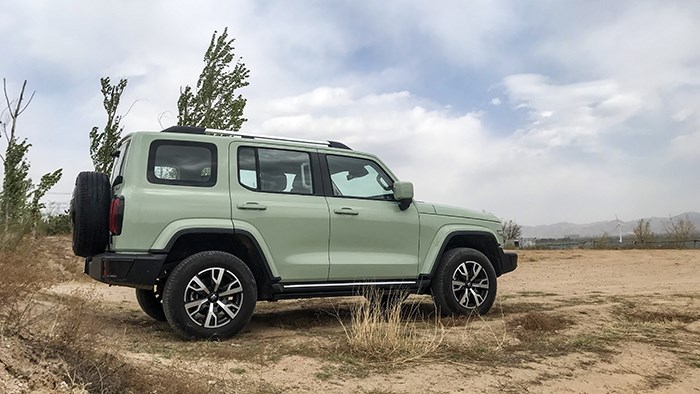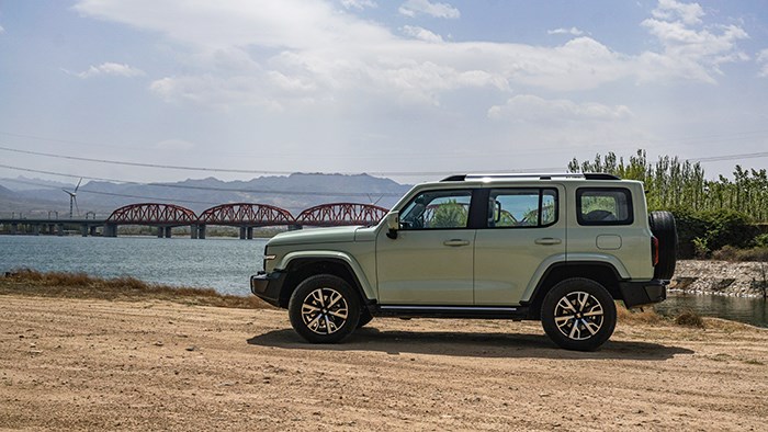 坦克300的側(cè)面輪廓四平八穩(wěn),擁有外突的大輪眉,并使用與車身同色的涂裝。車身上也沒有使用太多復(fù)雜的線條,觀感比較干練。