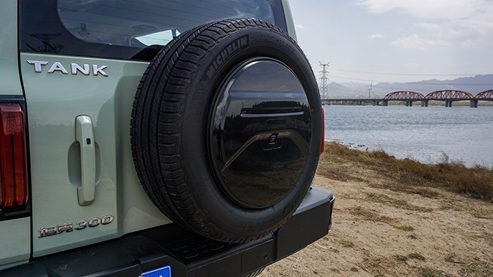 很多越野車都會(huì)選擇外露備胎的方式,不過坦克300還為備胎配備了輪胎保護(hù)罩,攝像頭巧妙的放在了中間部位。