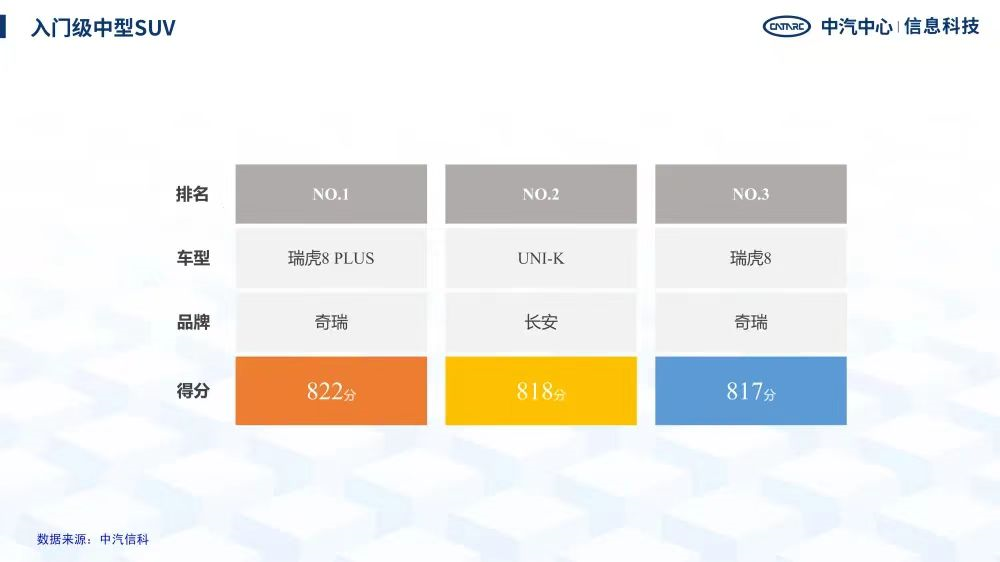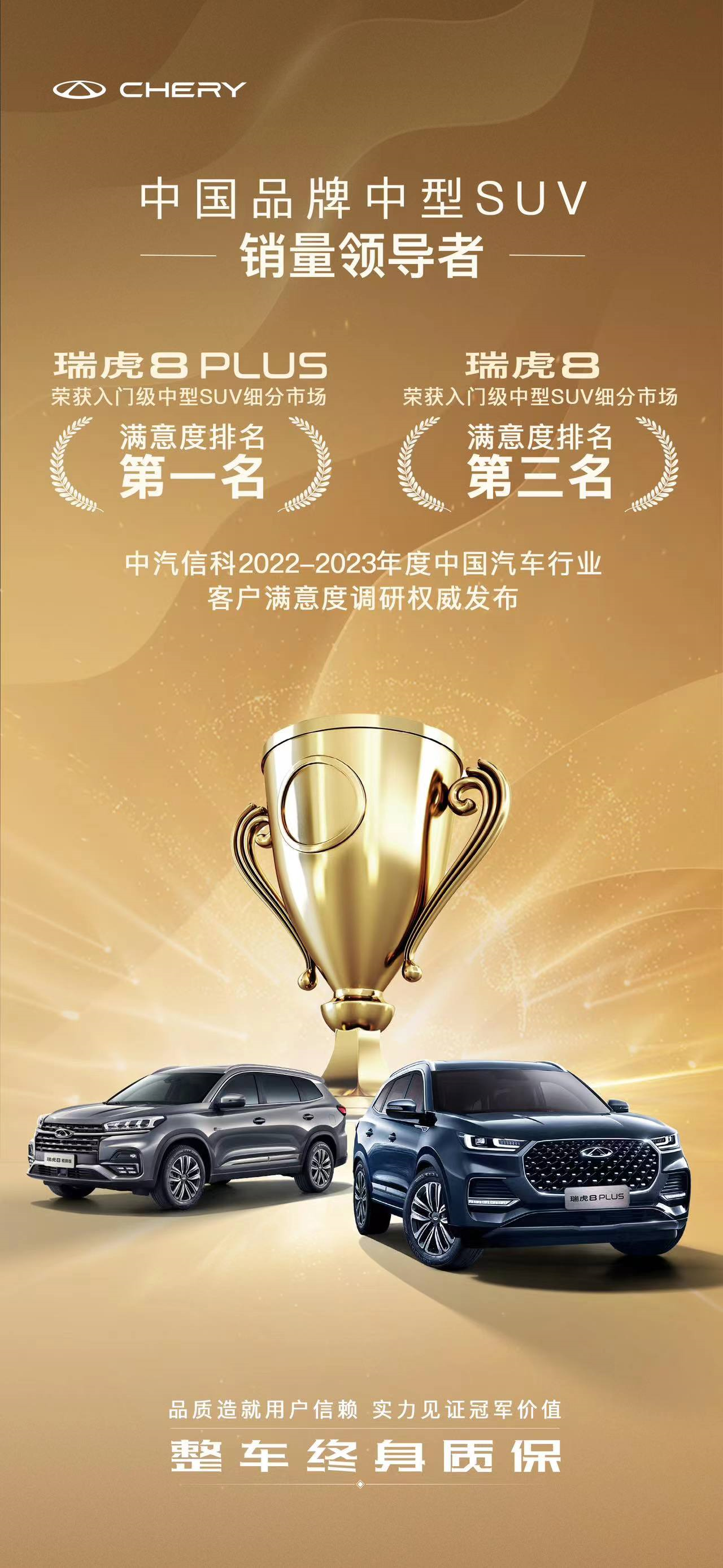 近日,中汽信息科技(天津)有限公司(以下簡稱“中汽信科”)發(fā)布了2022-2023年度中國汽車行業(yè)客戶滿意度結(jié)果,自主品牌持續(xù)發(fā)力,取得了亮眼的排行表現(xiàn)。來自奇瑞汽車的瑞虎8 PLUS、瑞虎8分別位居入門級中型SUV滿意度第一名與第三名,力壓眾多同級車型,成為該細分領(lǐng)域的佼佼者。