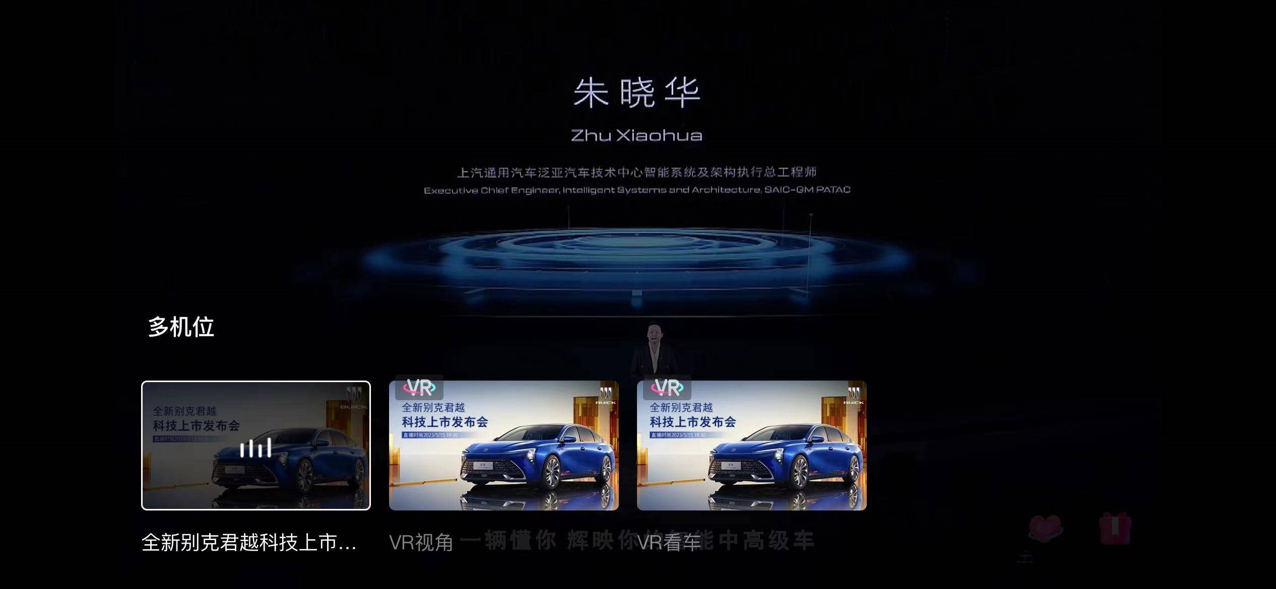 在PICO端,別克君越定制虛擬直播場,帶領(lǐng)車友解鎖前所未有的VR沉浸玩法,把新車直接“開到”眼前。端內(nèi)提供「現(xiàn)場發(fā)布會視角 新車車內(nèi)視角」雙VR機(jī)位,帶上一體機(jī),車友轉(zhuǎn)動頭部即可看到品牌專屬虛擬互動場,不在現(xiàn)場卻可以獲得“超現(xiàn)場級”的VVIP體驗(yàn):「現(xiàn)場發(fā)布會視角」采用“180°現(xiàn)場實(shí)拍 180°虛擬互動場 2D副屏”制作形式,疊加氣泡、光線、極光等5款既有特效和新車亮相定制特效,與全新別克君越的光塑美學(xué)設(shè)計(jì)語言交相輝映;「新車車內(nèi)視角」則進(jìn)行360°新車車內(nèi)實(shí)拍,看似不加修飾的畫面卻藏有巧思:只有“刪繁就簡”不疊加任何互動與特效,才能讓用戶以最清晰、高效的方式體驗(yàn)到最真實(shí)的新車,以“生圖”凸顯產(chǎn)品優(yōu)勢。