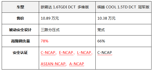 繽越COOL方面,其采用籠式車身設(shè)計,大量高強(qiáng)鋼和熱成型鋼的使用使其同樣具備優(yōu)秀的被動安全性,但其高強(qiáng)鋼含量只有66%,在一些特殊情況下,保護(hù)能力明顯是不及歐萌達(dá)的。