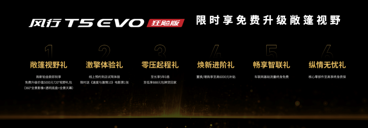 除此之外,風行T5 EVO狂飚版更有令人心動的福利政策。限時送《速度與激情10》電影票,只要線上預約到店試駕體驗即可領取,絕對是最純粹的福利,同時購新鉑金款即刻享免費升級價值5000元720°視野禮包,“零壓起程禮“可至長享5年0息,至低享888元包牌貸回家,“煥新進階禮”可享置換或增購至高6000元補貼,還有車聯網基礎流量終身免費,核心零部件至高享終身質保共六重大禮。