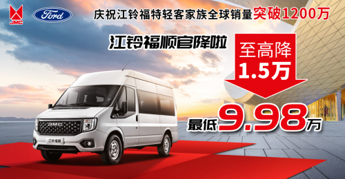 為慶祝江鈴福特輕客家族全球銷量突破1200萬輛,即日起江鈴福順官方降價(jià)1.5萬元。江鈴輕客不僅用更超值的價(jià)格,感恩千萬用戶的厚愛,共享全球1200萬車主榮耀,更進(jìn)一步滿足用戶對于江鈴輕客的旺盛需求,助力更多用戶賺錢致富。