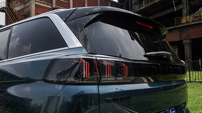車(chē)尾部分,后排的黑色隱私玻璃,搭配上懸浮的車(chē)頂,以及橫貫尾部的黑色飾板將尾燈、尾標(biāo)融為一體又與前大燈組呼應(yīng)。尾燈組內(nèi)部采用了更加復(fù)雜的多片式立體結(jié)構(gòu),LED光源點(diǎn)亮后很有高級(jí)感。
