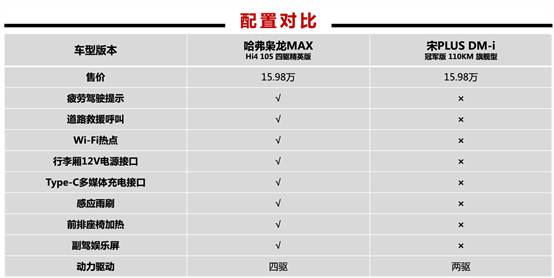 在安全配置方面,哈弗梟龍MAX全面升級(jí),哈弗梟龍MAX Hi4 105四驅(qū)精英版更是以更低的售價(jià)提供了更豐富的安全配備。多了疲勞駕駛、道路救援呼叫等功能,覆蓋了日常用車的方方面面,為駕駛者提供更全面的安全輔助。而且還是四驅(qū)動(dòng)力,為車輛提供更強(qiáng)大的動(dòng)力輸出和更穩(wěn)定的操控性能。相比之下,宋 PLUS DM-i冠軍版改款后,反而取消并線輔助/開(kāi)門預(yù)警/后向碰撞預(yù)警等日常駕駛高頻使用的安全智能配置,降低了安全系數(shù),顯得不夠誠(chéng)意。