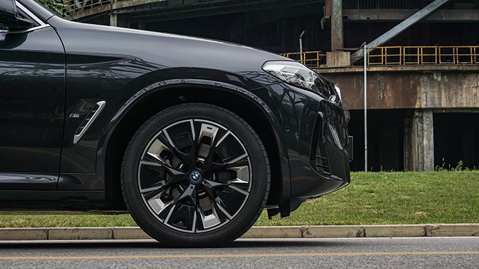 作為一臺純電車型,寶馬iX3的進(jìn)氣口采用了封閉式造型,但雙腎元素依舊保留。全新設(shè)計(jì)的3D立體效果自適應(yīng)LED大燈,犀利深邃,很有美感。這臺頂配的創(chuàng)領(lǐng)型使用了20英寸輪圈,輪轂造型十分有特點(diǎn),采用了245/45 R20輪胎。翼子板上鑲嵌了寶馬M運(yùn)動車標(biāo)。