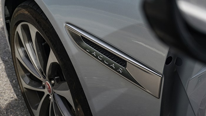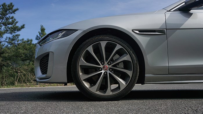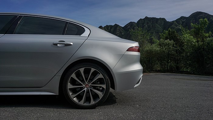 從側(cè)面看去,XEL低矮的車身姿態(tài)顯得十分運(yùn)動(dòng),蓄勢待發(fā),翼子板上的捷豹徽章是捷豹家族必不可少的設(shè)計(jì)元素。這臺(tái)頂配進(jìn)取運(yùn)動(dòng)版車型配備了18英寸雙色動(dòng)感輪圈(青春版為17寸),對于運(yùn)動(dòng)氛圍的營造來說絕對是利好的設(shè)計(jì),輪胎規(guī)格為馬牌的225/45 R18。尾部的單邊雙出排氣也符合XEL的年輕運(yùn)動(dòng)定位。