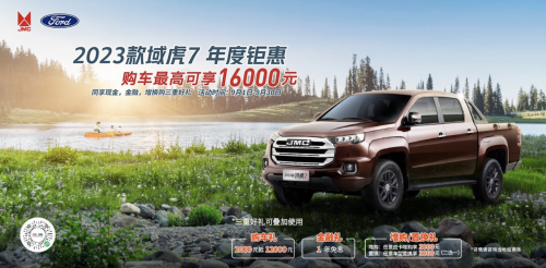 9月1日—30日,購買2023款域虎7車型購車最高可享16000元,并可同享現(xiàn)金、金融、增換購三重好禮。其中,購車禮:車型2000元抵12000元;金融禮:1年免息;增購/置換禮:增購—任意皮卡增購享3000元,置換—任意車型置換享3000元(二選一),三重好禮可疊加使用。