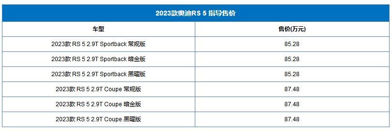 近日,2023款奧迪RS 5上市,共推出6款車型,售價區(qū)間為85.28-87.48萬。新車相比現(xiàn)款增加了常規(guī)款車型。