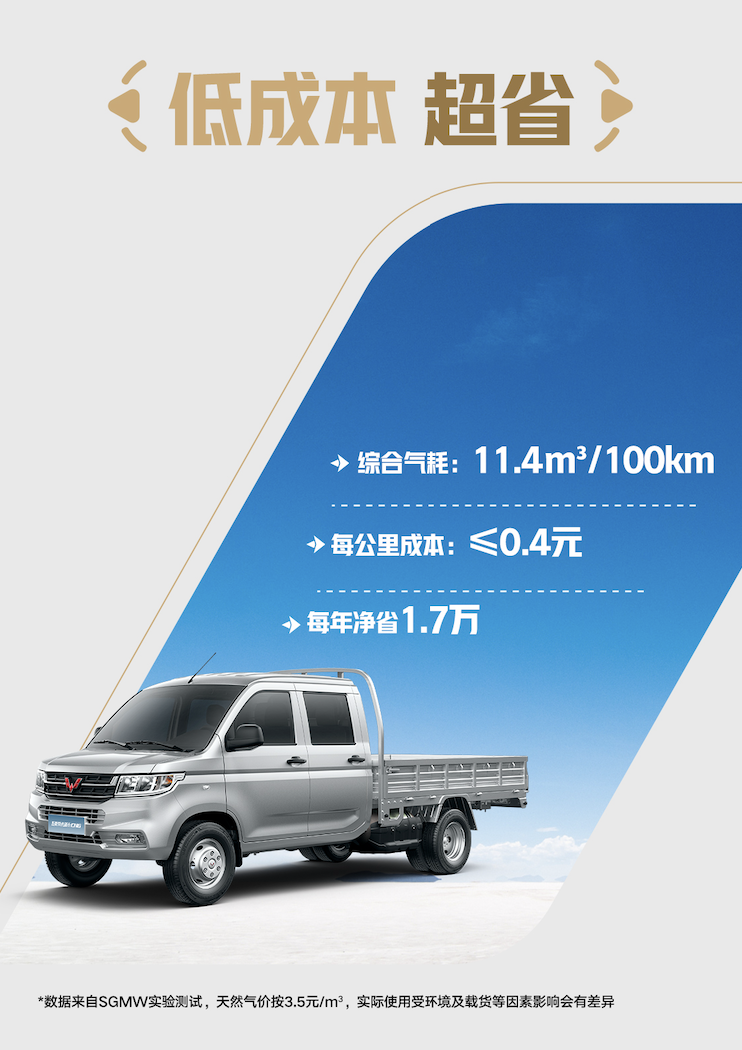 此次推出的榮光新卡雙后輪CNG版,在繼承五菱商用車品質(zhì)基因的同時,結(jié)合用戶需求和市場環(huán)境不斷進階,將節(jié)約成本落到實處,讓創(chuàng)業(yè)之路更加簡單,助力更多新時代奮斗者勇攀事業(yè)高峰,共創(chuàng)美好未來!