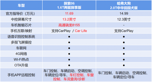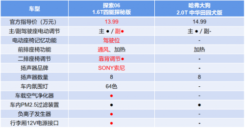如今年輕消費(fèi)群體越來越注重享受,在選擇車輛時(shí),那些配置更豐富、能帶來更好體驗(yàn)的產(chǎn)品往往更容易勝出。奇瑞探索06和哈弗大狗在配置方面都有超過20多萬合資車的表現(xiàn),但具體比較起來,奇瑞探索06配置更全面,也更具性價(jià)比。