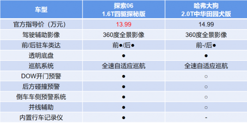 當(dāng)然,出去撒野更要保障行車安全。探索06基于中國、歐盟、東盟、澳洲、南美的全球五星安全的苛刻標(biāo)準(zhǔn)設(shè)計(jì),全車超80%高強(qiáng)度鋼,扭轉(zhuǎn)剛度23000Nm/deg,同級(jí)領(lǐng)先。配合籠式吸能太空艙車身設(shè)計(jì),為用戶把座駕打造成移動(dòng)的安全堡壘。此外,在主動(dòng)安全方面,探索06同樣表現(xiàn)出色。經(jīng)過對(duì)比可以看出,探索06在價(jià)格比哈弗大狗便宜10000元的情況下,在配置上多了DOW開門預(yù)警、后方碰撞預(yù)警、倒車車側(cè)預(yù)警系統(tǒng)、并線輔助等功能,無論是安全性能還是性價(jià)比都遙遙領(lǐng)先。