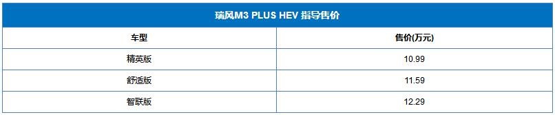 近日,瑞風M3 PLUS HEV正式上市,共推出3款車型,售價區(qū)間為10.99-12.29萬。