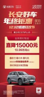 為助力更多用戶輕松開啟明日生活,長安汽車也限時推出“年終 鉅惠-12.12 感恩狂歡節(jié) ”活動 。12 月 1 日—31 日,消費者購買第 三代 CS75PLUS ,均有機會獲得全系現(xiàn)金直降 15000 元 、888 元享終身基礎(chǔ)保養(yǎng), 以及 0 首付 、0 月供 、0 利息等一系列驚喜好禮。