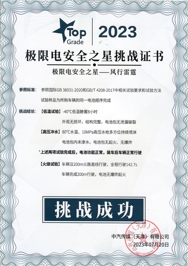 正如上面所描述的,理論上四維超高防護(hù)盾技術(shù)能對(duì)風(fēng)行雷霆的電池安全進(jìn)行極其完善地保護(hù),而實(shí)際上也是能做到的。為了讓消費(fèi)者能夠更加直觀地感受到其出色的電池安全性能,在中汽研TOP Safety測(cè)試中,車(chē)輛即使面對(duì)側(cè)柱碰撞、刮底、托底測(cè)試,電池也沒(méi)有太大的變形;而24小時(shí)水下浸泡電池的安全測(cè)試中,同樣順利通過(guò),可見(jiàn)鎧甲電池具有極高的安全性。而在中汽研Top Grand“極限電安全之星”證書(shū)認(rèn)證中,車(chē)輛成功通過(guò)低溫、高壓沖水及整車(chē)火燒的測(cè)試項(xiàng)目。