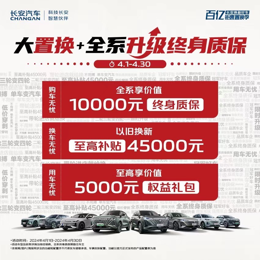 為助力用戶實(shí)現(xiàn)輕松換車、無憂用車,作為央企“國家隊(duì)”,長安汽車再放大招,近日正式推出“長安煥新好車 百億鉅惠置換季”活動,用戶通過大置換活動以舊換新,最高可享受45000元的置換補(bǔ)貼。