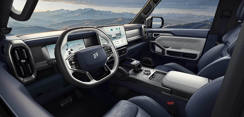 外觀方面,新車造型硬朗復(fù)古,黑色貫穿式中網(wǎng)融入大燈組。厚重的前杠還配有兩個熒光黃拖鉤。在車側(cè)則采用更立體的輪眉搭配大尺寸輪轂,進(jìn)一步突顯越野氣息。新車還采用懸浮式車身設(shè)計,車側(cè)配備腳踏板,車尾則提供小書包設(shè)計。車身尺寸方面,新車長寬高分別為4785*2006*1875(1910)mm,軸距2800mm。