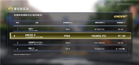 在純電續(xù)航測(cè)試環(huán)節(jié)中,懂車(chē)帝將路線設(shè)置在北京三環(huán)和四環(huán),全程平均車(chē)速控制在30-35公里/小時(shí)。經(jīng)懂車(chē)帝測(cè)試,長(zhǎng)安UNI-Z的純電續(xù)航里程達(dá)179.8公里,大幅超出其CLTC工況下標(biāo)稱(chēng)的125公里,續(xù)航達(dá)成率達(dá)143.8%,而在WLTC工況下其續(xù)航達(dá)成率更是高達(dá)189%。如此大幅度的反向虛標(biāo),長(zhǎng)安UNI-Z堪稱(chēng)汽車(chē)界的純電續(xù)航“虛標(biāo)王”。該成績(jī)不僅優(yōu)于一同測(cè)試的零跑C10、深藍(lán)S7和比亞迪宋PLUS DM-i,也較宋PRO DM-i實(shí)測(cè)的141.3公里純電續(xù)航有明顯優(yōu)勢(shì)。
