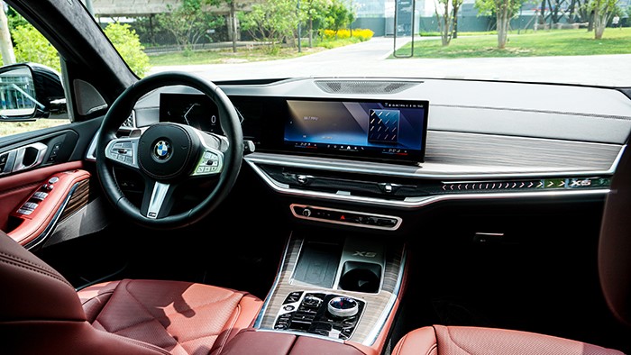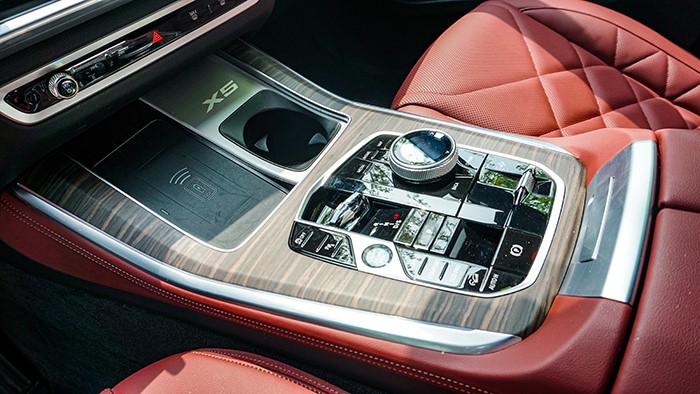 橫紋實(shí)木面板與鋼琴漆漆面、啞光色鋁條營(yíng)造出充滿豪華感的控制區(qū)。手機(jī)無限充電、X5精致徽章,均為操控者提供美觀與便捷。