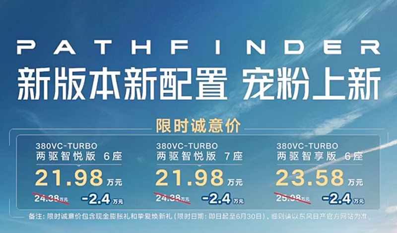 6月11日,東風(fēng)日產(chǎn)探陸新增3款車型上市,售價(jià)24.38-25.98萬。同時(shí)還開啟限時(shí)誠意價(jià),為21.98-23.58萬。