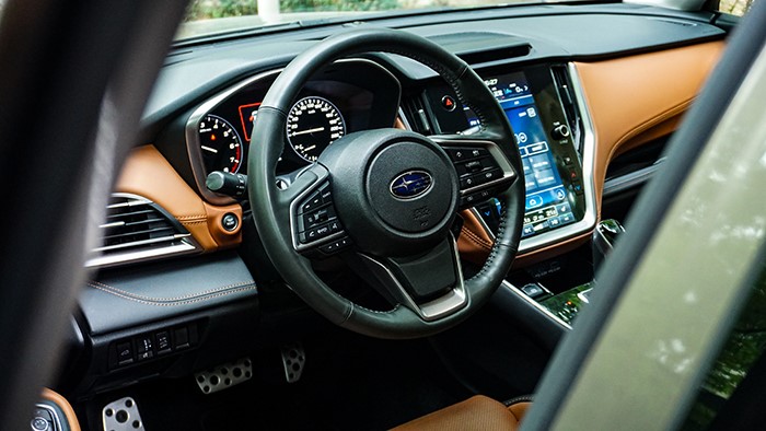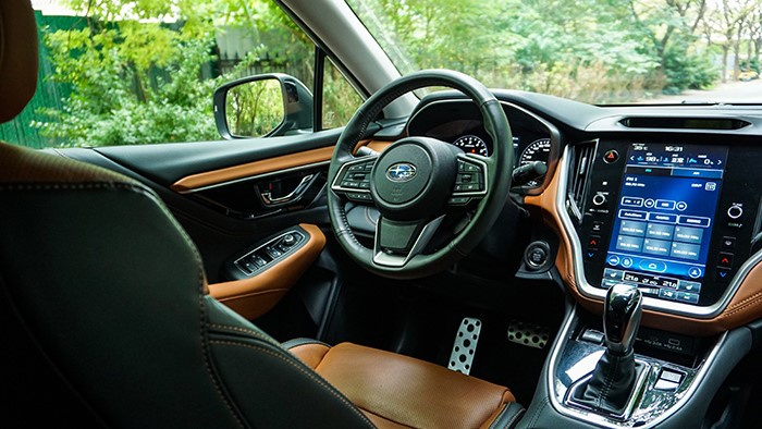 斯巴魯傲虎2.5i旗艦版的內(nèi)飾采用姜黃色與黑色的雙拼色設(shè)計(jì),棕色縫線,搭配少量的銀色裝飾件,與外觀酷酷的感覺(jué)相呼應(yīng)。