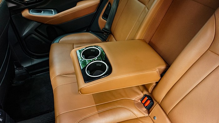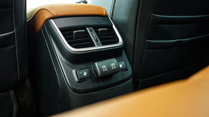 后排座椅同樣采用相同材質(zhì),同樣寬大柔軟舒適。中央地板處稍有隆起。后排還提供了兩檔座椅加熱以及獨(dú)立的空調(diào)出風(fēng)口,并帶有兩個(gè)USB充電接口。后排座椅靠背可通過(guò)兩側(cè)的調(diào)節(jié)開(kāi)關(guān)進(jìn)行角度調(diào)節(jié)。