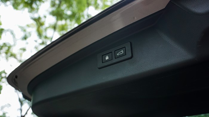 后備箱空間十分規(guī)整充裕,電動(dòng)尾門(mén)開(kāi)啟后,可在后備箱兩側(cè)發(fā)現(xiàn)有后排座椅靠背放倒開(kāi)關(guān),十分便捷。后排靠背放倒后形成的載物平臺(tái)十分平整。