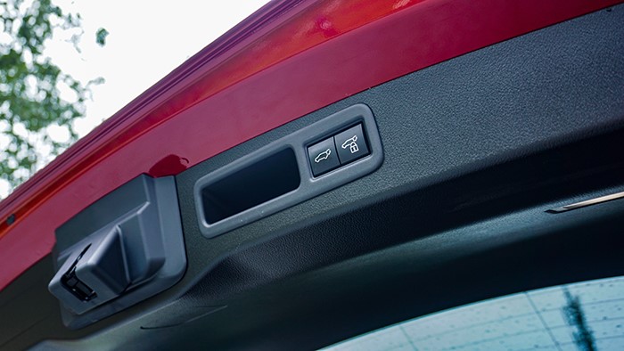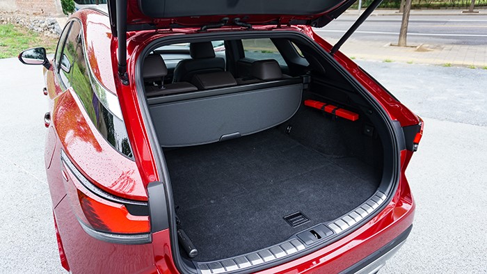 尾燈造型采用了貫穿式一體化造型,視覺(jué)效果十分精致。235/50 R21的輪胎配合車身尺寸剛好,電動(dòng)后備箱蓋升起后可看到RX450h+的后備箱平臺(tái)非常規(guī)整,并帶有后排座椅電動(dòng)折疊開(kāi)關(guān)。
