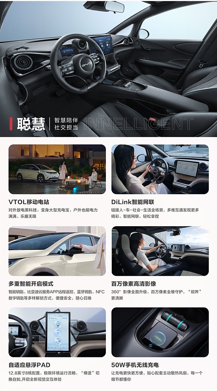 內(nèi)飾方面,新車采用12.8英寸自適應(yīng)懸浮中控PAD搭配液晶儀表,搭載DiLink智能網(wǎng)聯(lián),提供50W手機無線充電等配置。