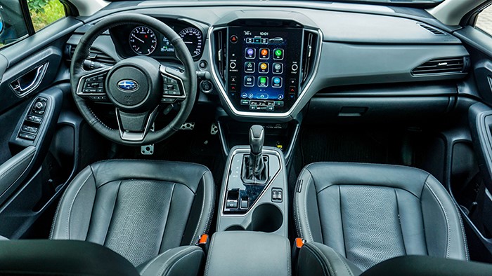 斯巴魯旭豹的內(nèi)飾設(shè)計(jì)方面,全車采用了黑色配色設(shè)計(jì),中控臺(tái)使用了仿碳纖維飾板提升運(yùn)動(dòng)感。進(jìn)口到國內(nèi)的車型配置了11.6英寸豎置中控屏,車廂布置依然很家族化,很像斯巴魯傲虎。