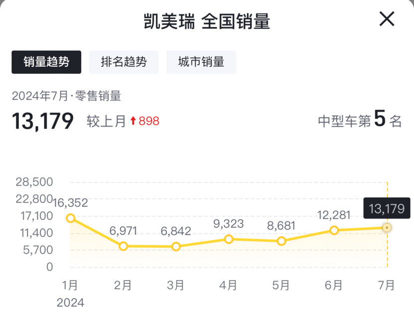 自古真情留不住,唯有降價(jià)得人心!前幾個(gè)月都說新款凱美瑞不行了,可如今凱美瑞的銷量又支棱起來了!年初的時(shí)候,新款凱美瑞的月銷量只有6000多,可在剛剛過去的七月份,凱美瑞的月銷量又攀升到了13,179輛。這銷量不算特別出眾,但也能排進(jìn)B級車中的銷量前五了。