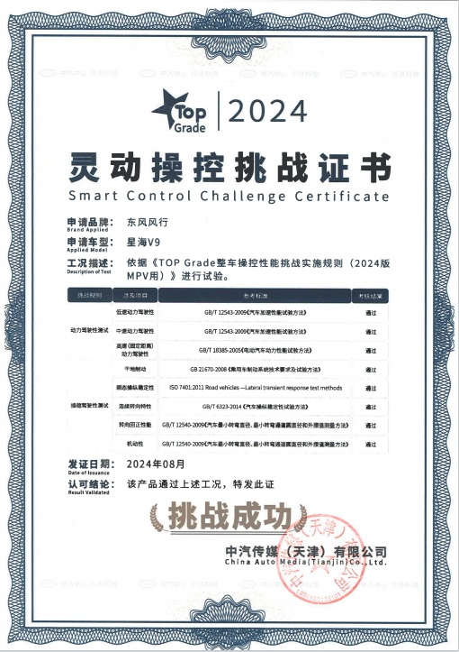 在出行需求日益多元化的今天,傳統(tǒng)轎車與SUV已難以滿足市場(chǎng)對(duì)于高舒適性、長(zhǎng)續(xù)航性及強(qiáng)操控性的綜合追求。正是這一市場(chǎng)空白的存在,促使了MPV車型,尤其是集豪華與智能于一身的MPV逐漸成為現(xiàn)代家庭與商務(wù)場(chǎng)合的出行新寵。作為風(fēng)行星海序列的首款“豪華智電頭等艙”,星海V9憑借其卓越的操控性、強(qiáng)勁的動(dòng)力以及極致的舒適度,精準(zhǔn)地滿足了消費(fèi)者的期待。近日,星海V9更以不凡的技術(shù)實(shí)力和出色的性能表現(xiàn)順利通過(guò)TOP Grade三維綜合挑戰(zhàn)。挑戰(zhàn)涵蓋了尊享舒適、靈動(dòng)操控、無(wú)憂續(xù)航三大維度,成功斬獲挑戰(zhàn)證書(shū)。