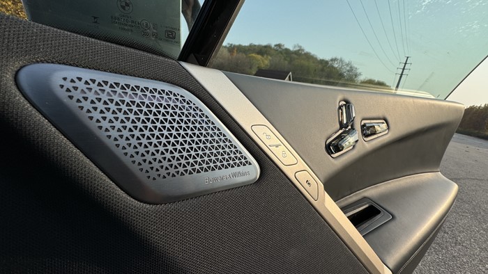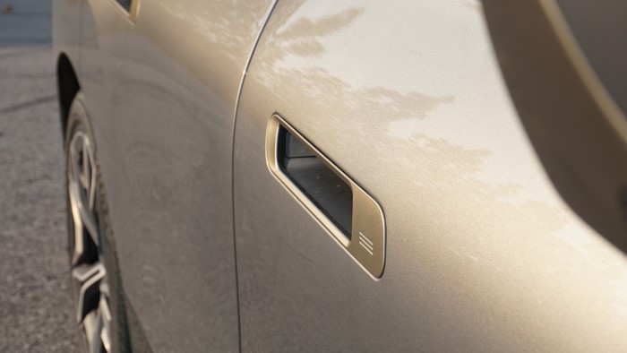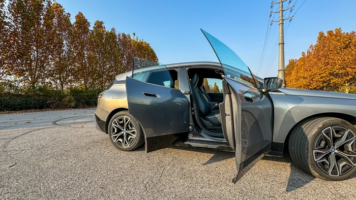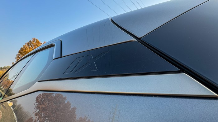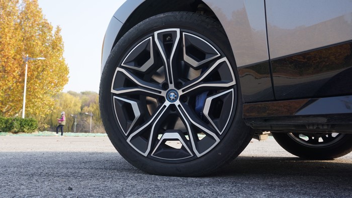 iX全系標(biāo)配21寸輪轂和255/50 R21的輪胎。本試駕車選裝了22寸輪轂,輪胎規(guī)格升級(jí)為275/40 R22。四門均為無(wú)框玻璃門設(shè)計(jì)。右后翼子板設(shè)計(jì)了充電接口,車門把手內(nèi)設(shè)計(jì)有隱藏式電子開關(guān)。