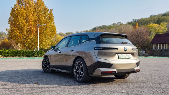 車門玻璃下沿使用泰坦金色裝飾延伸至車尾,黑色iX標(biāo)識(shí)鑲嵌在C柱上。整個(gè)車身的設(shè)計(jì)靈感源于經(jīng)過(guò)精細(xì)打磨的巨石,也就是寶馬所稱的“原石切割”。所以可以在車身圓潤(rùn)中透著很多折角線條。